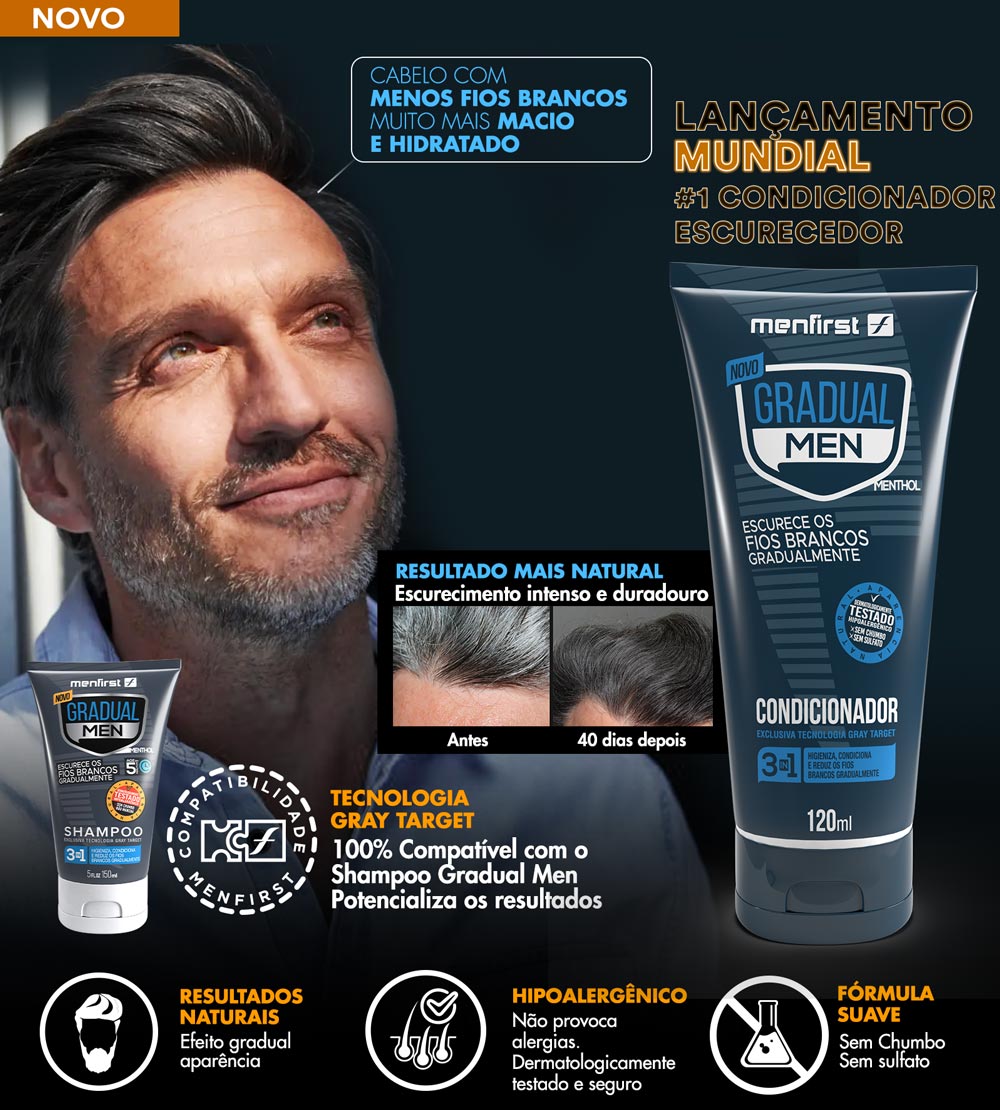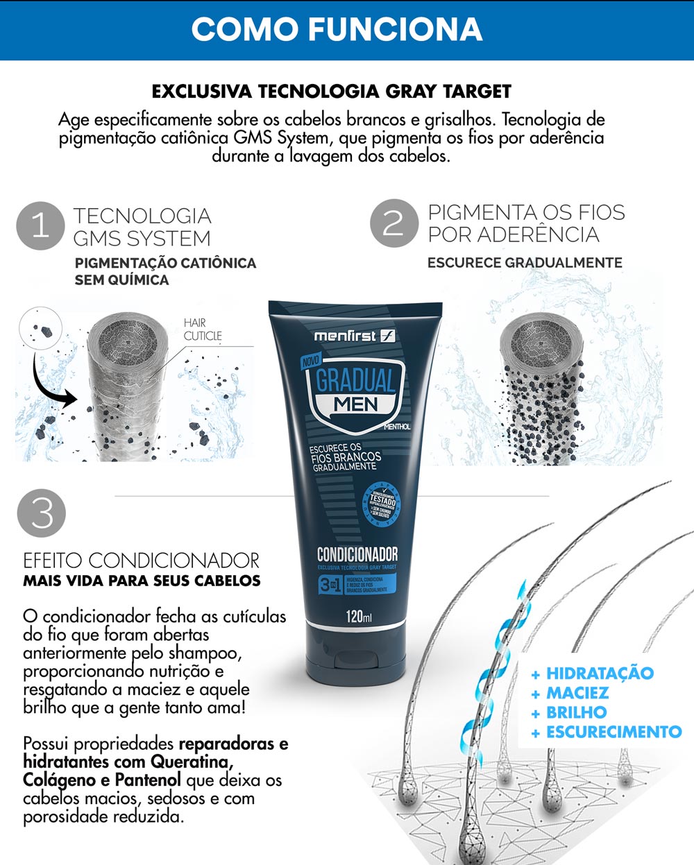 Condicionador Escurecedor Gradual Men Menfirst que intensifica e revitaliza a cor dos cabelos grisalhos de forma progressiva e gradual doando um aspecto de cor sempre natural, ele possui a tecnologia exclusiva de pigmentação Gray Target, a mesma do Shampoo Gradual Men.