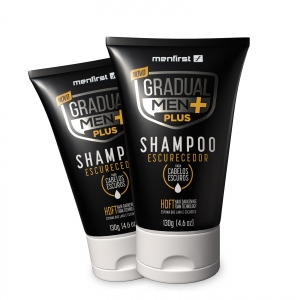 1 - Shampoo Gradual Men Plus - O Mais Potente Escurecedor da MenFirst Chega de esperar por resultados! Conheça o novo Shampoo Escurecedor Gradual Men Plus ? mais potente e eficaz do que nunca. Com o dobro da intensidade, ele escurece os fios brancos de forma rápida e com naturalidade. Equipado com a exclusiva Tecnologia Gradual Target Plus, o Gradual Men Plus localiza e escurece os fios brancos com precisão. Apenas 3 minutos no banho, e já na segunda aplicação, você verá a diferença: fios visi