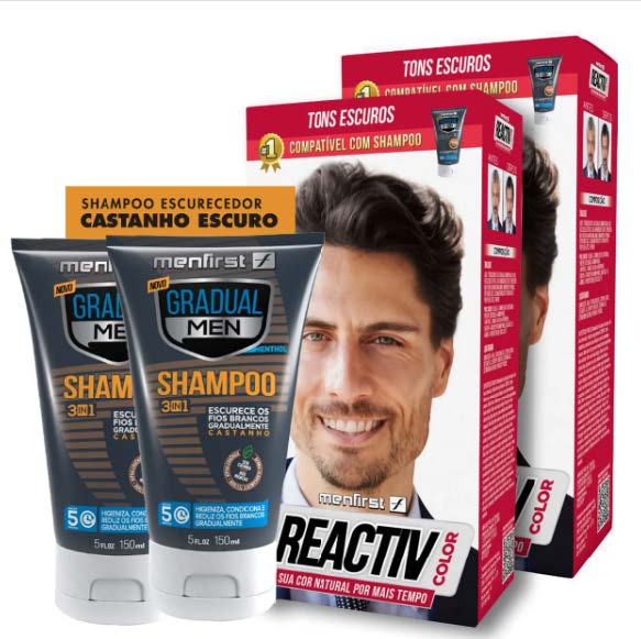 Combo Shampoo Escurecedor Gradual Men e Condicionador Escurecedor Gradual Men Menfirst que intensifica e revitaliza a cor dos cabelos grisalhos de forma progressiva e gradual doando um aspecto de cor sempre natural, ele possui a tecnologia exclusiva de pigmentação Gray Target, a mesma do Shampoo Gradual Men. Exclusiva Tecnologia Gray Target Age especificamente sobre os cabelos brancos e grisalhos. Tecnologia de pigmentação catiônica GMS System, que pigmenta os fios por aderência durante a la
